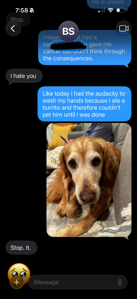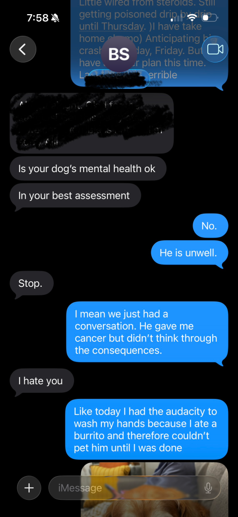 Getting another six rounds is a bummer for sure—but not a huge disruption, since I’ll already be going back to Schar for Herceptin infusions through March 2027 anyway. (Herceptin is part of the breast cancer regimen. Remember that cancer? My breast oncologist came to meet me during my infusion this week to check in, and let me tell you—it is very weird for everyone in the room to know that a fucking breast cancer oncologist is now on the “back burner.”)