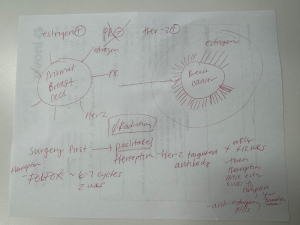 One thing I’ve learned is that each “chemo” is really a cocktail of medications. The standard breast cancer chemo regimen I would have done has two main components–paclitaxel and herceptin. I can’t have Paclitaxel because it would be too toxic to combine with FOLFOX. The good news is that two of the drugs in FOLFOX have been used to treat breast cancer in the past, and the entire breast tumor board is confident that, in my case, the FOLFOX drugs will be sufficient in place of Paclitaxel.